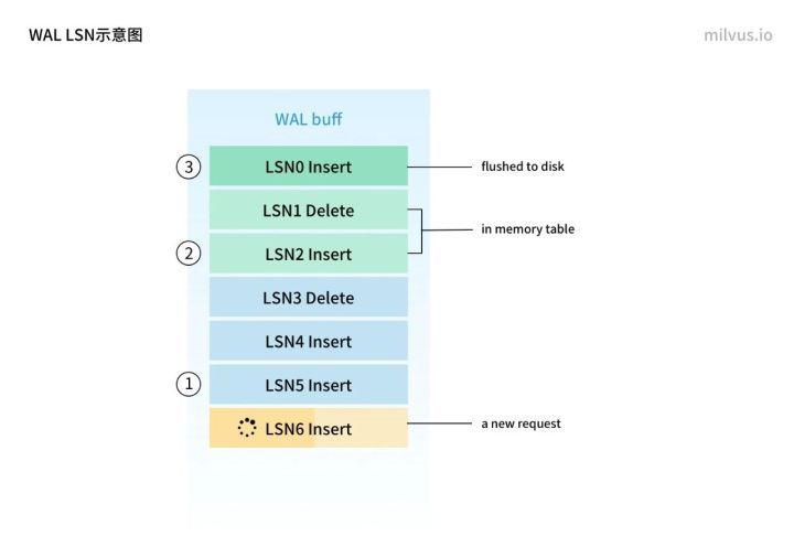 WAL 通过 LSN(Log sequence number,日志序号)来实现数据的一致性。Milvus为用户的每次修改操作分配一个 LSN,这些 LSN 随用户的操作数严格递增。系统通过维护以下这些关键 LSN 点就能保证数据的一致性了:①用户操作的最大LSN;②已经反映到内存但还未落盘的最大LSN;③已经落盘的最大LSN。