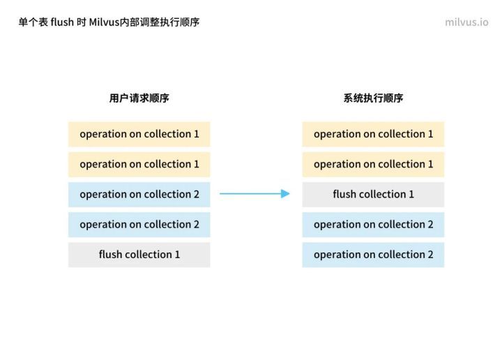 flush 可以指定所有集合,也可以指定单个集合。如果用户指定单个集合,为尽可能短的阻塞用户线程,Milvus 内部还会调整执行顺序并优先执行 flush。下面例子是一种可能的调整结果,调整前后对用户效果等价,但用户线程的阻塞时间会明显减少。
