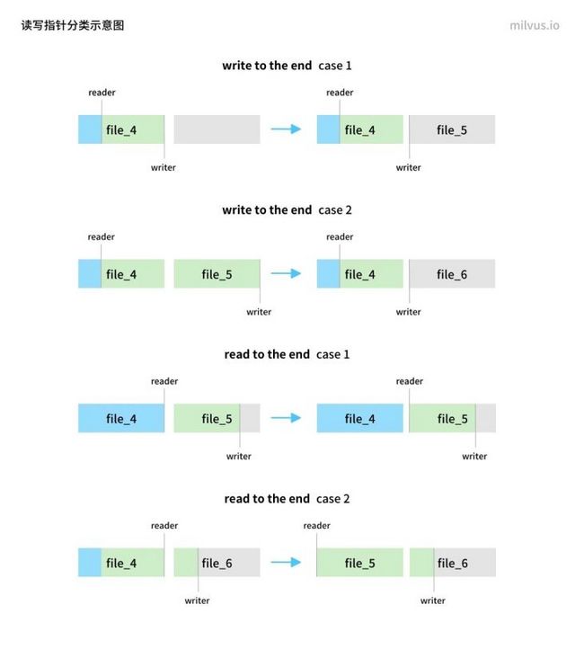 Milvus 在这里使用了双缓冲区。初始时读写指针指向同一片数组;当写指针写到数组尾部时,会判断读指针是否和自己共享同一片缓冲,若是则新数据写往另一片缓冲,否则当前缓冲从头写起;而读指针在追赶写指针时,发现读到缓冲尾部时需判断另一片缓冲的内容是否是当前内容的下一片,若是则从下一片缓冲头部读起,否则需要把下一片内容从磁盘加载到当前缓冲。具体分类示意图见下: