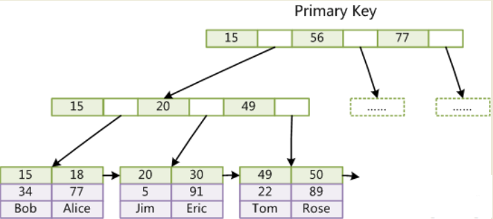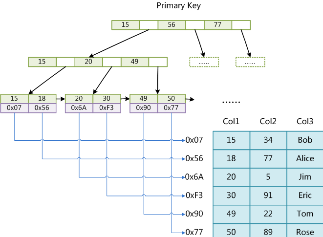 InnoDB是聚集索引,数据文件是和(主键)索引绑在一起的,即索引 + 数据 = 整个表数据文件,通过主键索引到整个记录,必须要有主键,通过主键索引效率很高。但是辅助索引需要两次查询,因为辅助索引是以建索引的字段为关键字索引到主键,所以需要两次,先查询到主键,然后再通过主键查询到数据。因此,主键不应该过大,因为主键太大,其他索引也都会很大。话不多说上图: