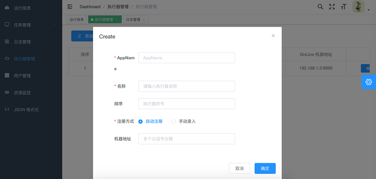 - 2、"执行器列表" 中显示在线的执行器列表, 可通过"OnLine 机器"查看对应执行器的集群机器;