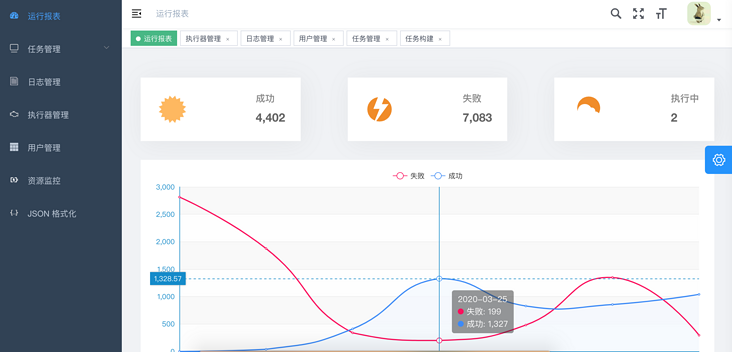 - 16、运行报表:支持实时查看运行数据,以及调度报表,如调度日期分布图,调度成功分布图等;
