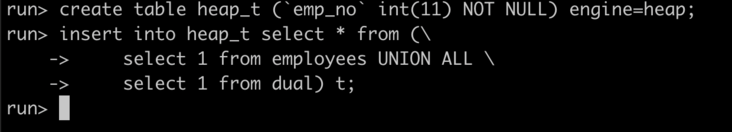 我们都知道内存临时表是 memory(heap) 引擎格式的表,那我们手工建一个显式的内存表,应当和内存临时表使用的内存相同,来试验一下。