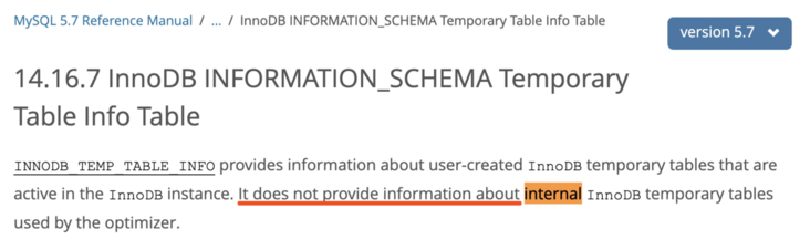 MySQL 在其他元数据中,诸如 information_schema.INNODB_TEMP_TABLE_INFO 中,并不展示内部临时表的信息,如图: