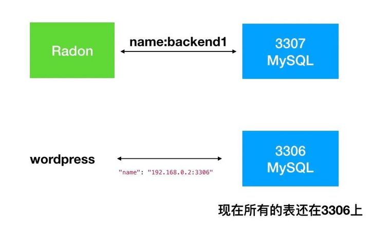 首先利用Radon reshard 把原来一个非拆分表,变成一个新的拆分表, 这里有一个不错的设计, 该操作完,也不会把wp_posts表删除,这是一个不错的设计。后面利用改表名后,再来看看业务运行情况。现在的架构如下 :