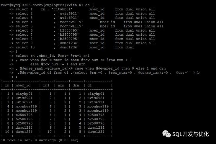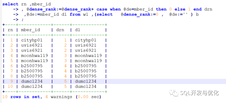 -> ,@de:=mber_id d1 from w1 ,(select @dense_rank:=0 , @de:='' ) b