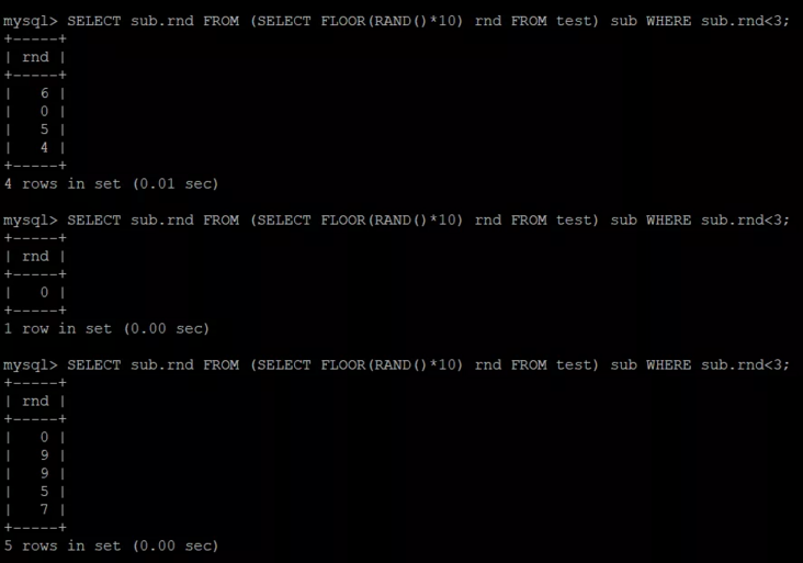 SELECT sub.rnd FROM (SELECT FLOOR(RAND()*10) rnd FROM test) sub WHERE sub.rnd明明指定了筛选内层