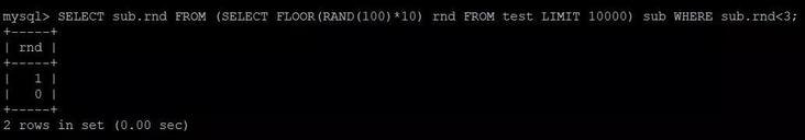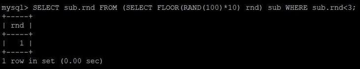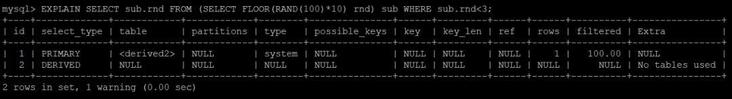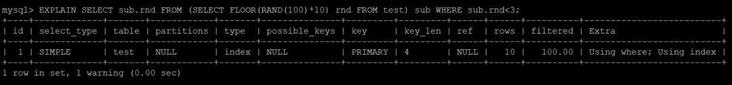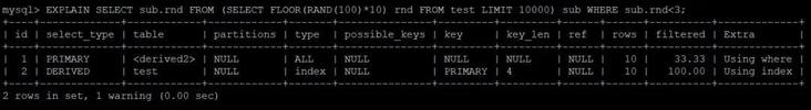 SELECT sub.rnd FROM (SELECT FLOOR(RAND(100)*10) rnd) sub WHERE sub.rnd哈?并没有问题?再 EXPLAIN 一波