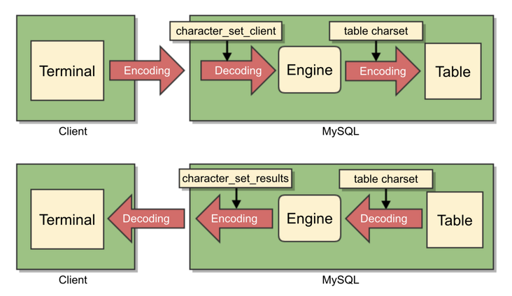 在客户端将一条命令输入MySQL时,MySQL只知道这条命令是0101的字节流,并不知道具体采用的是什么编码。第一个参数