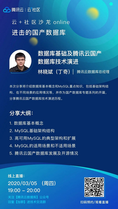 3月5日19:00-20:00,腾讯云数据库总经理林晓斌(网名丁奇)作为特邀嘉宾将做客直播间,分享主题为《数据库基础及腾讯云国产数据库技术演进》,扫码即可预约直播,获取《MySQL实战45讲》的实时番外篇~