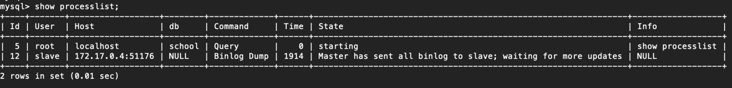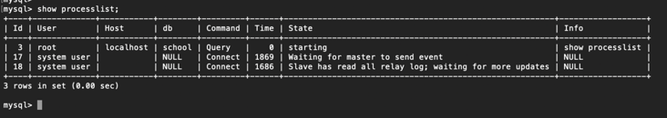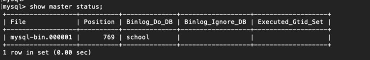 1. 创建新数据表及增加数据 create table user( id int(10) auto_increment, name varchar(30), primary key (id) )charset=utf8mb4; insert into user(name) values(222); 2. 主服务器 binlog 记录状态 mysql> show master status; +------------------+----------+--------------+------------------+-------------------+ | File | Position | Binlog_Do_DB | Binlog_Ignore_DB | Executed_Gtid_Set | +------------------+----------+--------------+------------------+-------------------+ | mysql-bin.000001 | 769 | school | | | +------------------+----------+--------------+------------------+-------------------+