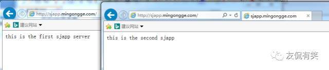 [root@centos conf]# curl http://10.0.0.1 this is the userapp server [root@centos conf]# curl http://10.0.0.1 this is the second userapp [root@centos conf]# curl http://app.mingongge.com this is the userapp server [root@centos conf]# curl http://app.mingongge.com this is the second userapp [root@centos extra]# curl http://sjapp.mingongge.com this is the first sjapp server [root@centos extra]# curl http://sjapp.mingongge.com this is the second sjapp