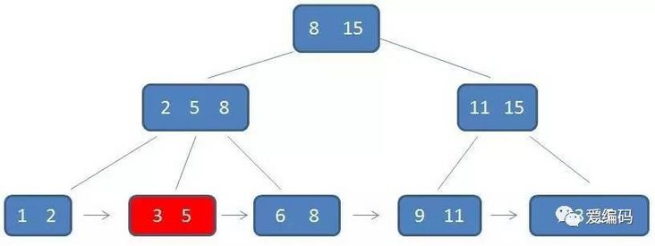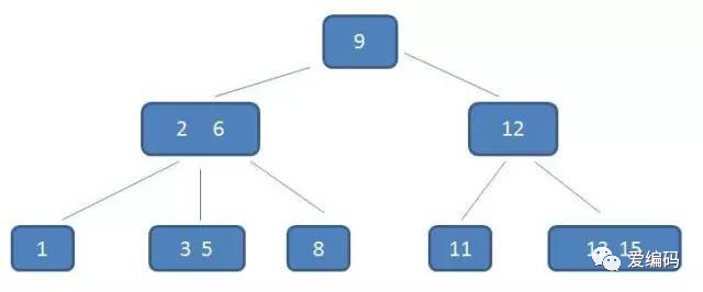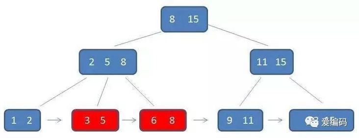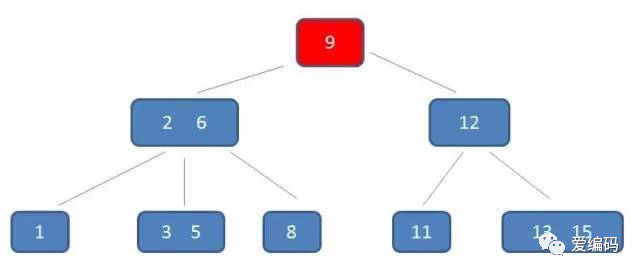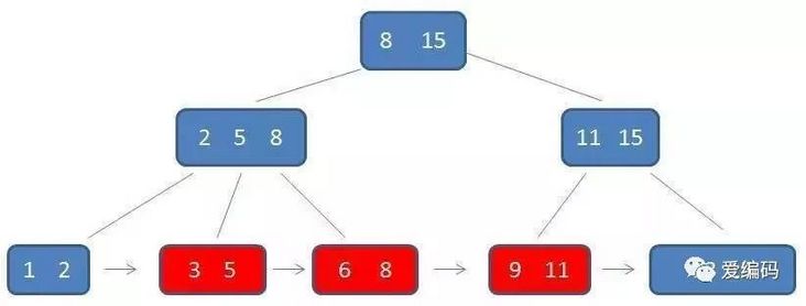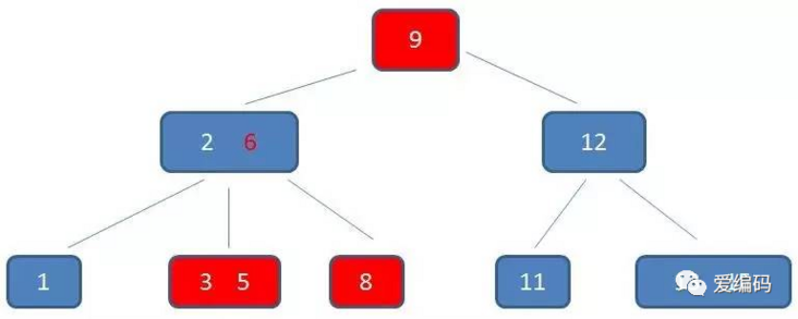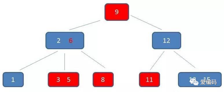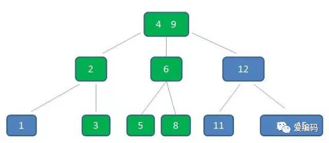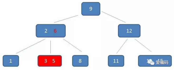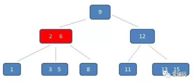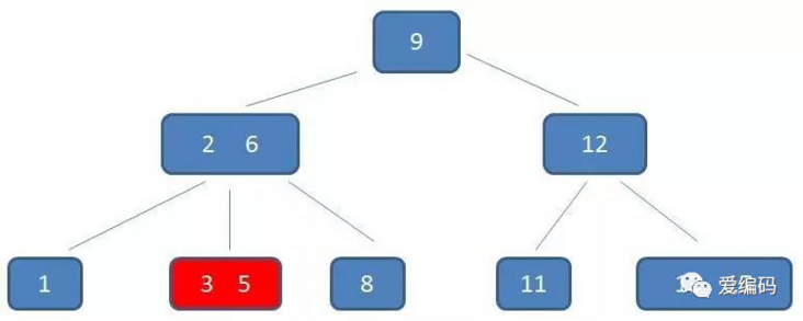 这棵树中,重点看(2,6)节点。该节点有两个元素2和6,又有三个孩子1,(3,5),8。其中1小于元素2,(3,5)在(2,6)之间,8大于(3,5),正好符合上面所列的特征。