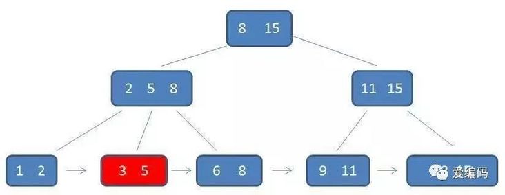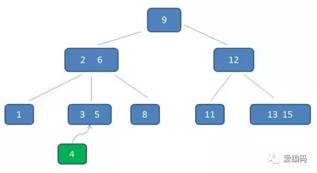 比如树里添加数值4 自顶向下查找4的节点位置,发现4应当插入到节点元素3,5之间