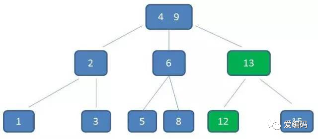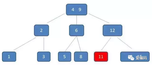节点3,5已经是两元素节点,无法再增加。父亲节点 2, 6 也是两元素节点,也无法再增加。根节点9是单元素节点,可以升级为两元素节点。于是拆分节点3,5与节点2,6,让根节点9升级为两元素节点4,9。节点6独立为根节点的第二个孩子。