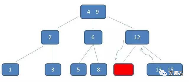 删除11后,节点12只有一个孩子,不符合B树规范。因此找出12,13,15三个节点的中位数13,取代节点12,而节点12自身下移成为第一个孩子。(这个过程称为左旋)