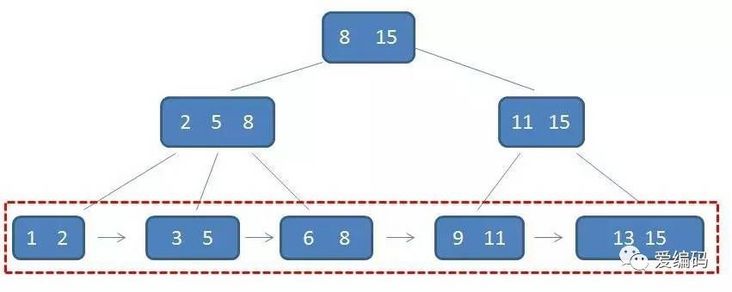 B+树是在B树的基础上进行改造,它的数据都在叶子结点,同时叶子结点之间还加了指针形成链表。