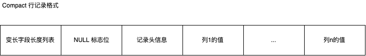 mysql> create table compact_test ( c1 int primary key, c2 VARCHAR(10), c3 VARCHAR(10) NOT NULL, c4 CHAR(10), c5 int ) CHARSET=utf8 ROW_FORMAT=COMPACT;