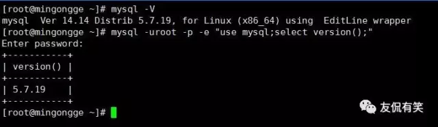 mysql -V mysql -uroot -ppassowrd -e "use mysql;select version();"