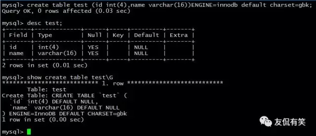 create table test ( id int(4), name varchar(16) )ENGINE=innodb DEFAULT CHARSET=gbk;