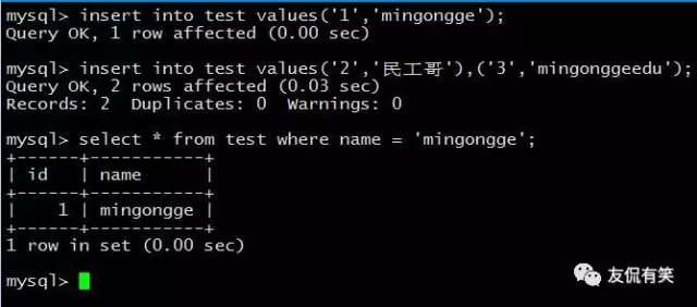 insert into test values('2','民工哥'),('3','mingonggeedu');