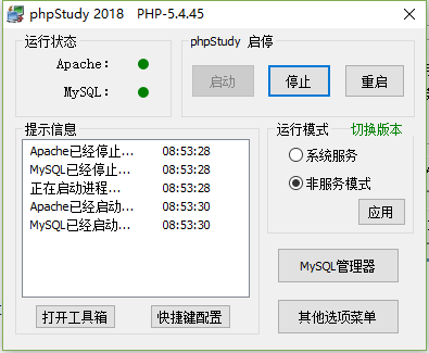 以下就是phpstudy启动成功的样子,两个大大的"绿点"