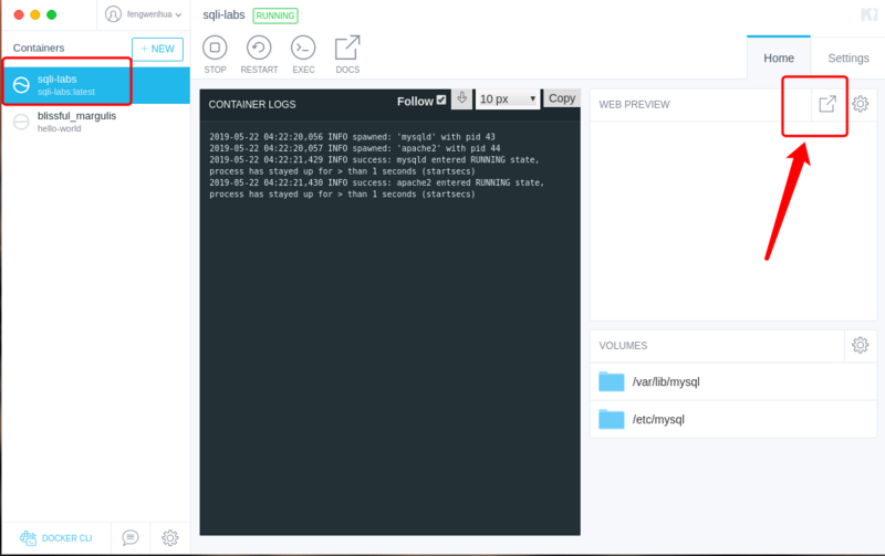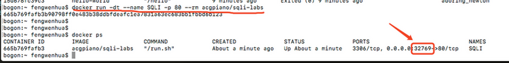 docker run -dt --name SQLI-LABS -p 80 --rm acgpiano/sqli-labs #run 创建一个新的容器并运行一个命令 #-d 表示后台运行,返回容器id #-t 为容器重新分配一个伪输入终端,通常与 -i 同时使用 #--name SQLI-LABS 将容器命名为SQLI-LABS #-p 80 将acgpiano/sqli-labs的80端口映射到本地的PORT端口