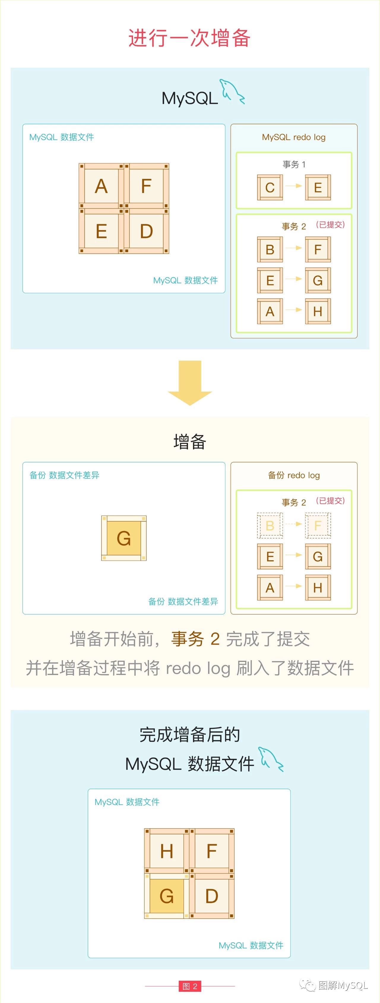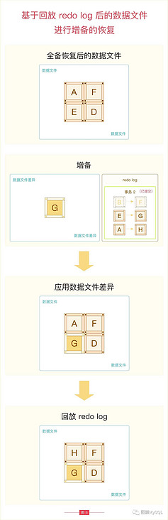 如图 4 所示,后续恢复增备文件时,继续回放了事务 2 的后一部分(E->G A->H),导致最终的数据文件中丢失了事务 2 第一部分的数据(B->F),惨剧就发生了。