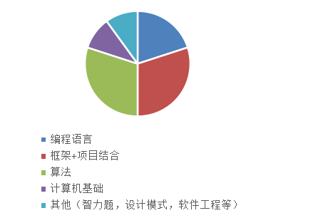 可以看到,算法占比是最大的,算法不好的话编程题根本没法做,而且在线oj和本地就是不一样,本地通过在线就不一定能通过,如何复习就看你自己怎样规划了,找对点,要在该下功夫的地方下功夫,比如为了笔试,框架弄的再透,再精通,可能也就能得几分。所以我们也能看到为什么有的人花费那么大的心力还是学不好,很可能没用在点上。