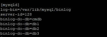[mysqld] log-bin=/var/lib/mysql/binlog server-id=128 binlog-do-db = cmdb