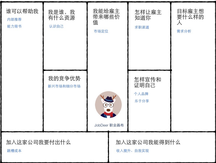 下面我来解释下各个部分。首先,JobDeer职业画布是以价值论为基础的,所以最中间就