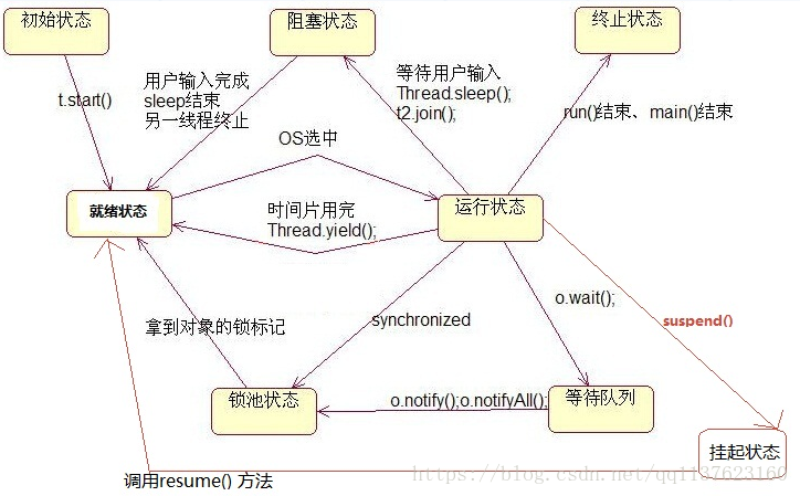 (3)、其他阻塞:运行的线程执行sleep()或join()方法,或者发出了I/O请求时,JVM会把该线程置为阻塞状态。当sleep()状态超时、join()等待线程终止或者超时、或者I/O处理完毕时,线程重新转入就绪状态。
