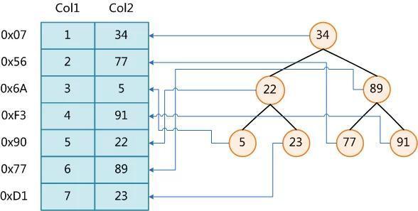 左侧为数据记录的物理地址,右侧为查找树,需要注意的是,逻辑上相邻的记录在磁盘上也并不是一定物理相邻的。实际的数据库应用中我们往往使用 B+ 树或者 LSM 来替代二叉查找树或者红黑树来构建索引系统,并且充分利用 虚拟存储管理 https://url.wx-coder.cn/PeNqS 一节中介绍过的局部性原理、磁盘预读与页缓存等概念。