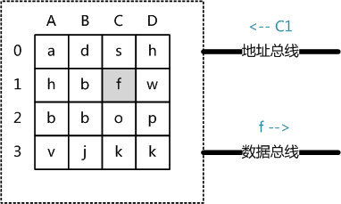 当系统需要读取主存时,则将地址信号放到地址总线上传给主存,主存读到地址信号后,解析信号并定位到指定存储单元,然后将此存储单元数据放到数据总线上,供其它部件读取。写主存的过程类似,系统将要写入单元地址和数据分别放在地址总线和数据总线上,主存读取两个总线的内容,做相应的写操作。这里可以看出,主存存取的时间仅与存取次数呈线性关系,因为不存在机械操作,两次存取的数据的“距离”不会对时间有任何影响,例如,先取 A0 再取 A1 和先取 A0 再取 D3 的时间消耗是一样的。