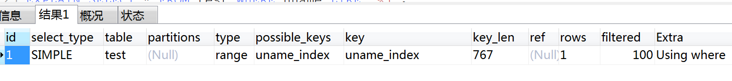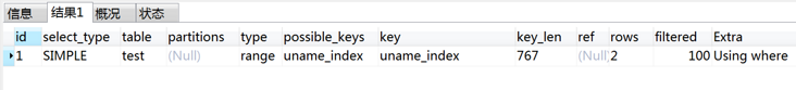 type的值为:range,key的值为uname_index,也就是说这种情况下,使用了索引。