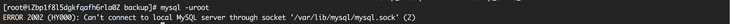 ,查看mysql日志文件:/var/backup/iZbp1f8l5dgkfqafh6rla0Z.err,mysql socket文件路径为/tmp/mysql.sock,mysql -uroot -S /tmp/mysql.sock,登录成功。