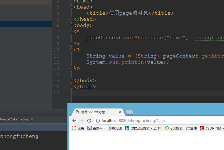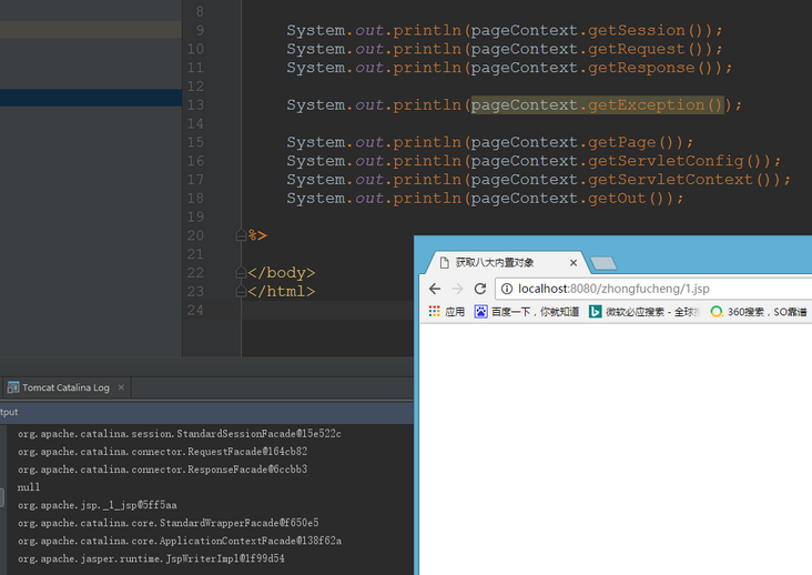 - pageContext本质上代表的是当前JSP页面编译后的内容,作为域对象而言,它就代表着当前JSP页面(也就是page)!也就是说:pageContext域对象只在page范围内有效,超出了page范围就无效了!