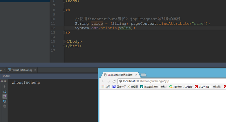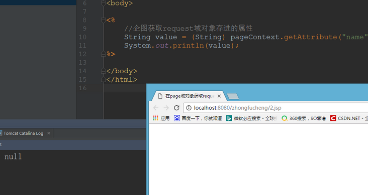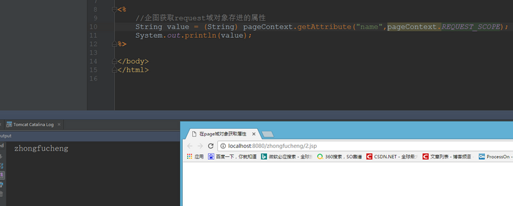 - 刚才我们没有使用重载方法的时候,使用pageContext是无法获取到request域对象设置的属性的。现在我们使用重载后的方法看一下能不能获取得到!
