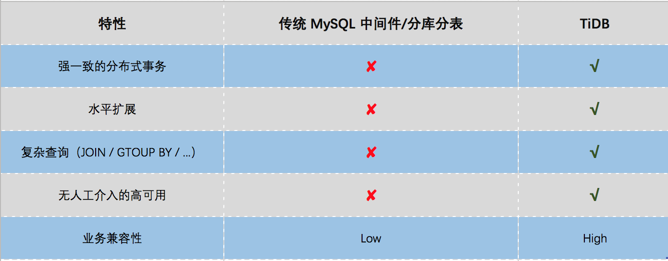TiDB 是一款定位于在线事务处理/在线分析处理(HTAP)的融合型数据库产品,具备在线弹性水平扩展、分布式强一致性事务、故障自恢复的高可用、跨数据中心多活等核心特性;对业务没有任何侵入性,能优雅的替换传统的数据库中间件、数据库分库分表等 Sharding 方案,并在此过程中保证了事务的 ACID 特性。同时它也让开发运维人员不用关注数据库 Scale 的细节问题,专注于业务开发,极大的提升研发的生产力。用户可以把 TiDB 当作一个容量无限扩展的单机数据库,复杂的分布式事务和数据复制由底层存储引擎来支持,开发者只需要集中精力在业务逻辑的开发上面。下图为 TiDB 与传统的 MySQL 中间件方案的一些对比: