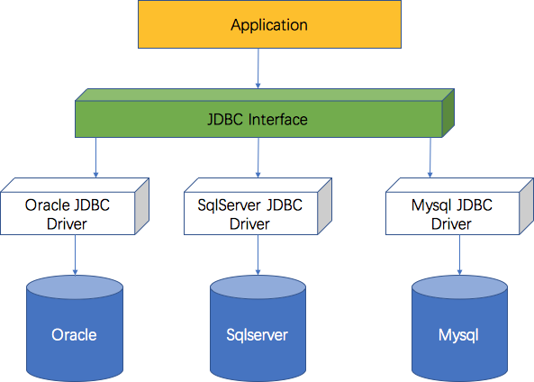 如果用图来表示的话,如上图所示,开发者不必为每家数据通信协议的不同而疲于奔命,只需要面向JDBC提供的接口编程,在运行时,由对应的驱动程序操作对应的DB。