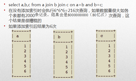 所以我们建议在多表join的时候尽量少join几张表,因为一不小心就是一个笛卡尔乘积的恐怖扫描,另外,我们还建议尽量使用left join,以少关联多.因为使用join 的话,第一张表是必须的全扫描的,以少关联多就可以减少这个扫描次数.