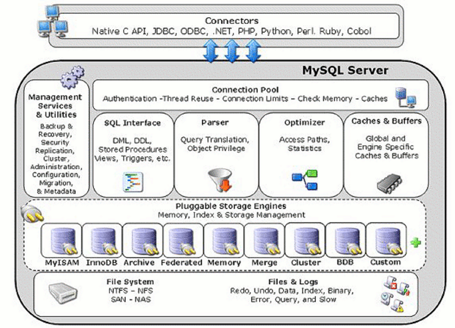 MySQL由SQL接口,解释器,优化器,缓存,存储引擎构成