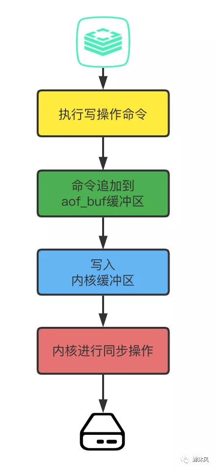 Redis成功执行写操作指令,然后将写的指令按照自定义格式追加到aof_buf缓冲区,这是第一个缓冲区;