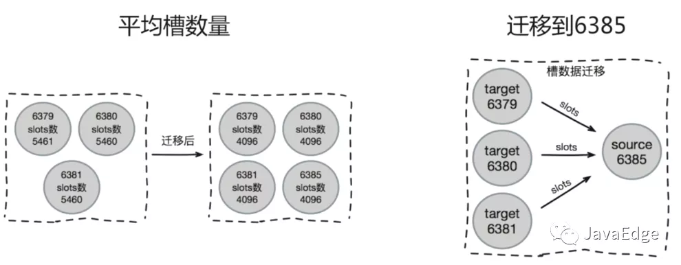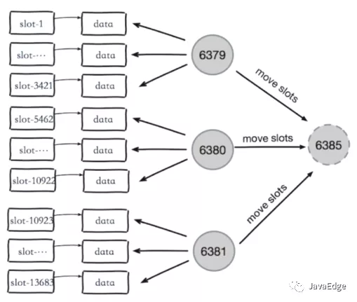 向如下集群中新加入一个节点6385。由于负载均衡的要求,加入后四个节点每个节点负责4096个slots,但集群中原来的每个节点都负责5462个slots,所以6379、6380、6381节点都需要向新的节点6385迁移1366个slots。