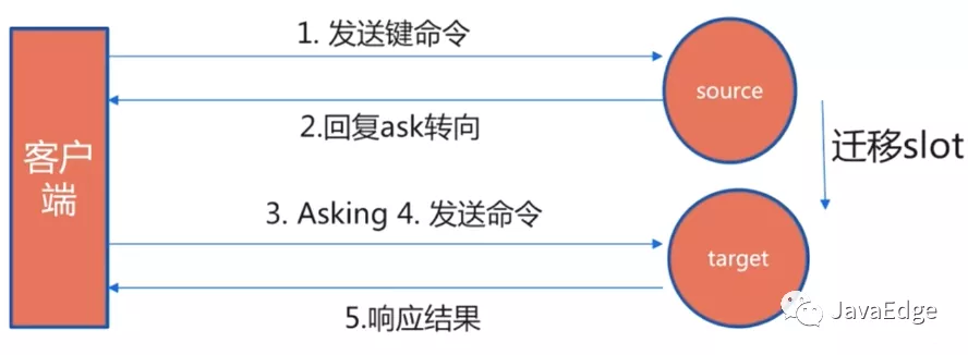当客户端访问某key,节点告诉客户端key在源节点,再去源节点访问时,却发现key已迁移到目标节点,就会返回ask。