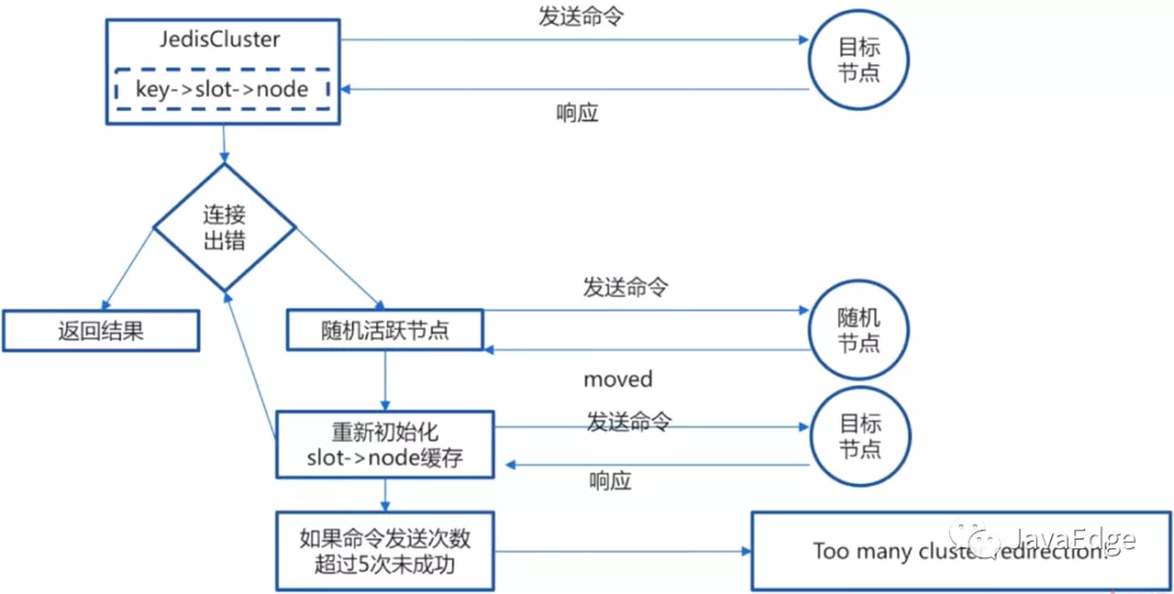 如果命令发送次数超过5次,则抛出异常"Too many cluster redirection!"