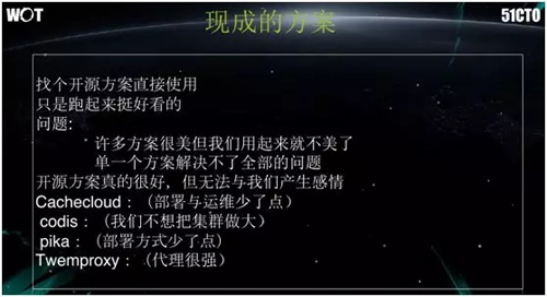 Codis,本身做了一个很大的集群,但是我们考虑到当这么一个超大池出现问题时,整个团队在应对上会失去灵活性。