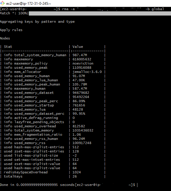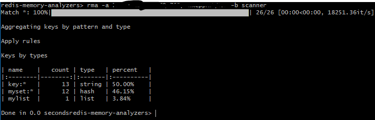 您可以很容易地通过命令行来使用它,其语法为:“rma [-s HOST] [-p PORT] [-a PASSWORD] [-d DB] [-m pattern-to-match] [-l number-of-keys-to-scan] [-b BEHAVIOUR] [-t comma-separated-list-of-data-types-to-scan]”