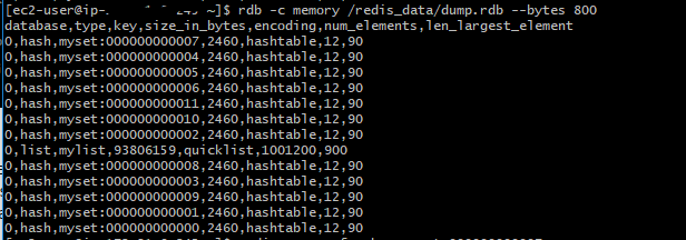 获取所有大于128字节的键值:rdb -c memory /var/redis/6379/dump.rdb --bytes 128 -f memory.csv