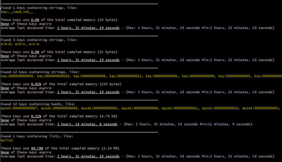在RAM模式下,我们得到键值空间级别的内存开销值,当然大多数其他开源的内存分析工具也能提供。因此,此处将a:b:1和a:c:1分别当作a:b:*和a:c:*,我们从而得到有关内存使用、实际数据大小、开销、编码、最小和***TTL等方面的详细信息。这些都有助于我们查出那些系统中内存消耗“大户”。